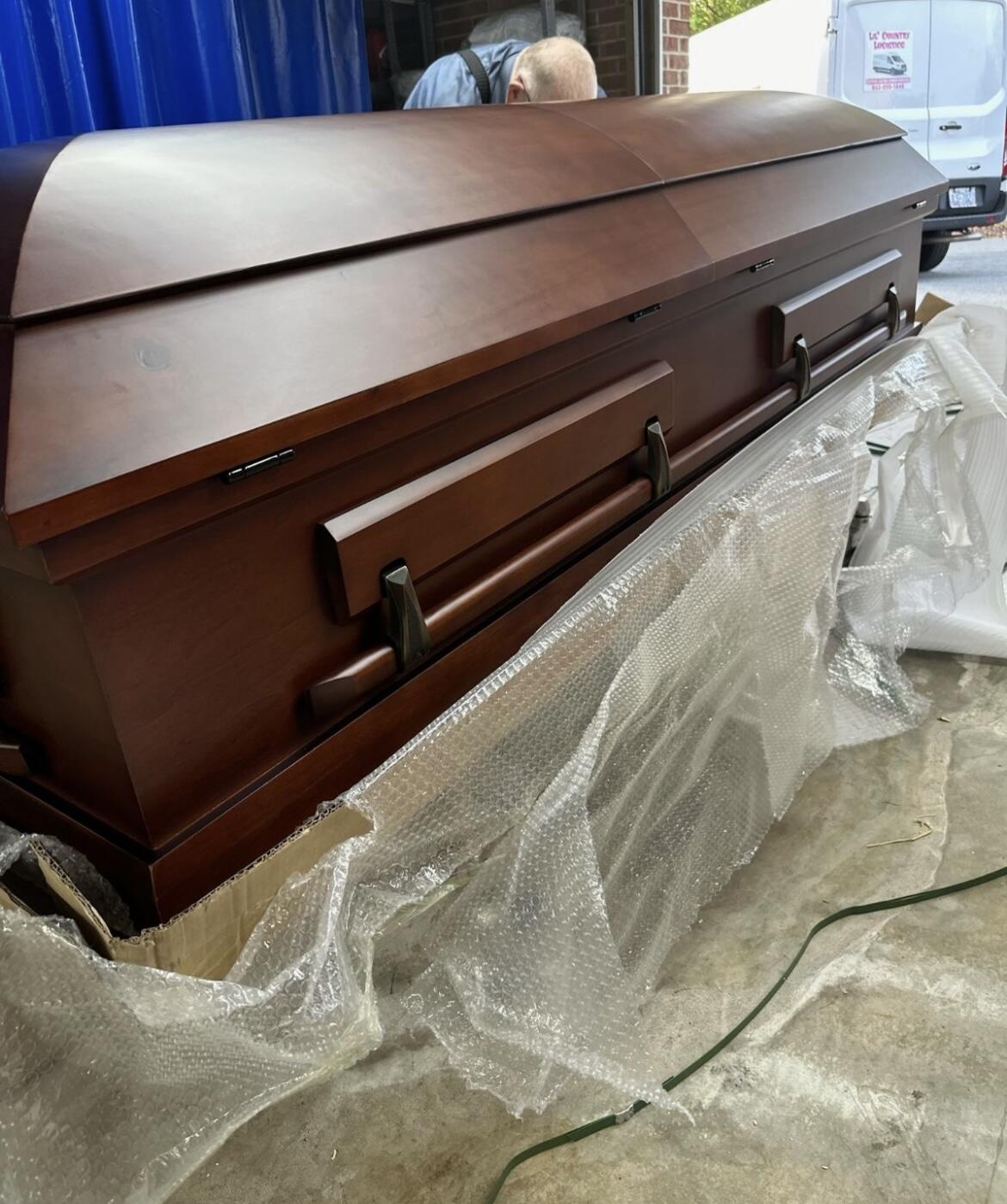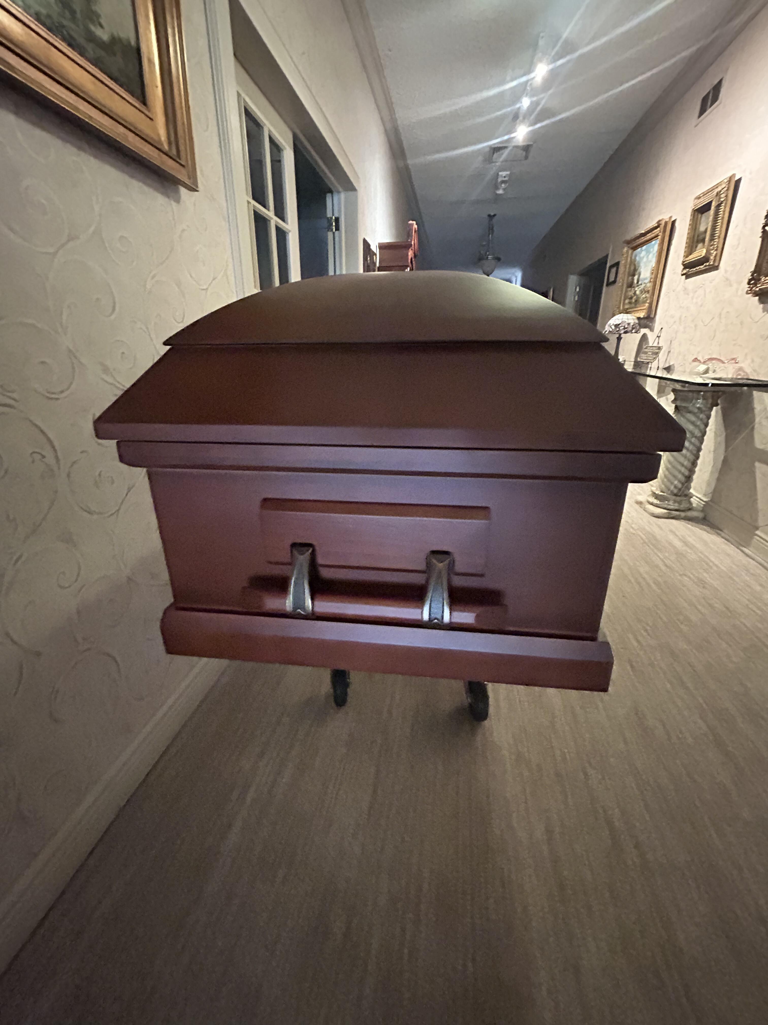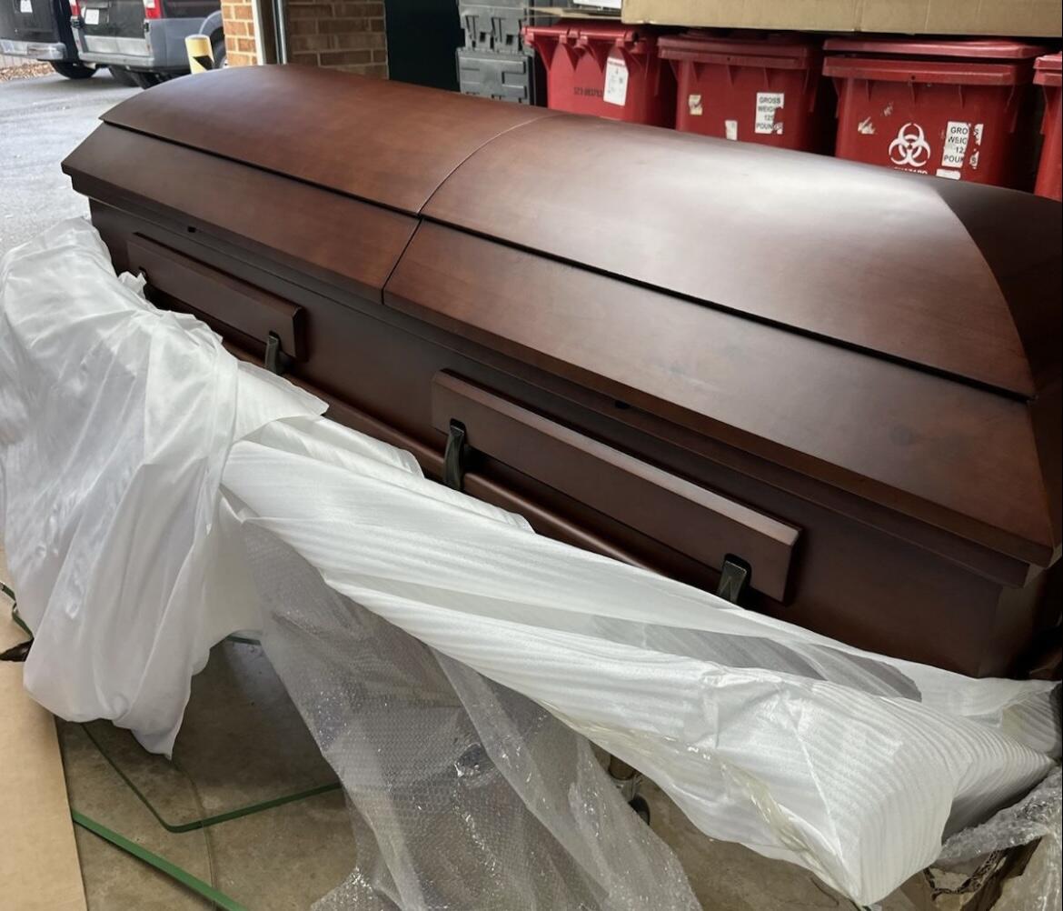 Delivered as promised, looked better than the much more expensive casket at the funeral home. This was far easier and I still can’t believe you can order a casket online.